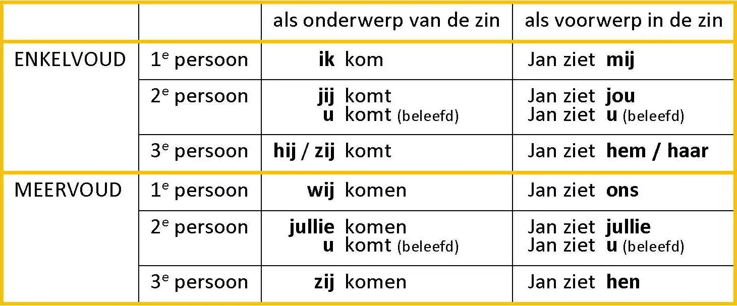plural: wij, we, jullie, zij, ze, ons, onze, jullie, hun |