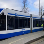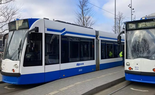 Een tram is geen trein. De tram is blauw met wit.