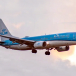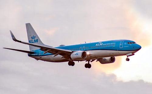 Een vliegtuig vliegt in de lucht. Het vliegtuig heeft vertraging.